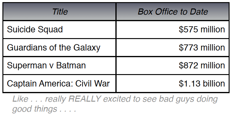 So an interesting thing has happened with our protagonists lately. They have flaws. Like, lots and lots of flaws. Most recently, the movie Suicide Squad focuses on really really bad guys who have killed multiple people. The current version of Superman has made mistakes and questioned himself and his motivations, while the world seems partly scared of him. Guardians of the Galaxy features bounty hunters and thieves who are arrested at the beginning of the story. The latest Avengers tale begins with a mistake made by the “good guys” that leads to many of them being treated as bad guys. In fact, it’s recently been confirmed in the cinematic universe that Steve Rogers is no longer Captain America, leaving the possibility he might swing into anti-hero territory. Why are moviegoers so excited to see bad guys doing good things? Great question.
